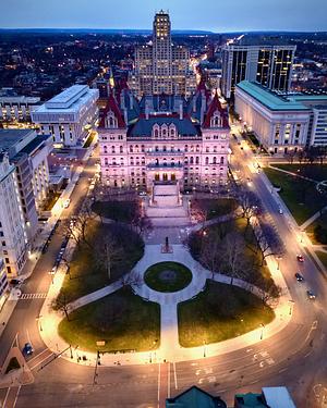 Albany at Twilight: This aerial photo captures the majestic New York State Capitol building at dusk, glowing under the city lights. Framed by the surrounding historic architecture, including the Alfred E. Smith Building rising proudly in the background, the scene highlights the balance of modernity and history in downtown Albany. The intricate symmetry of the landscaping, coupled with the warm streetlights illuminating the area, evokes a serene yet vibrant energy. A perfect addition for lovers of urban and architectural photography, this print is available in various sizes and finishes to enhance your space.